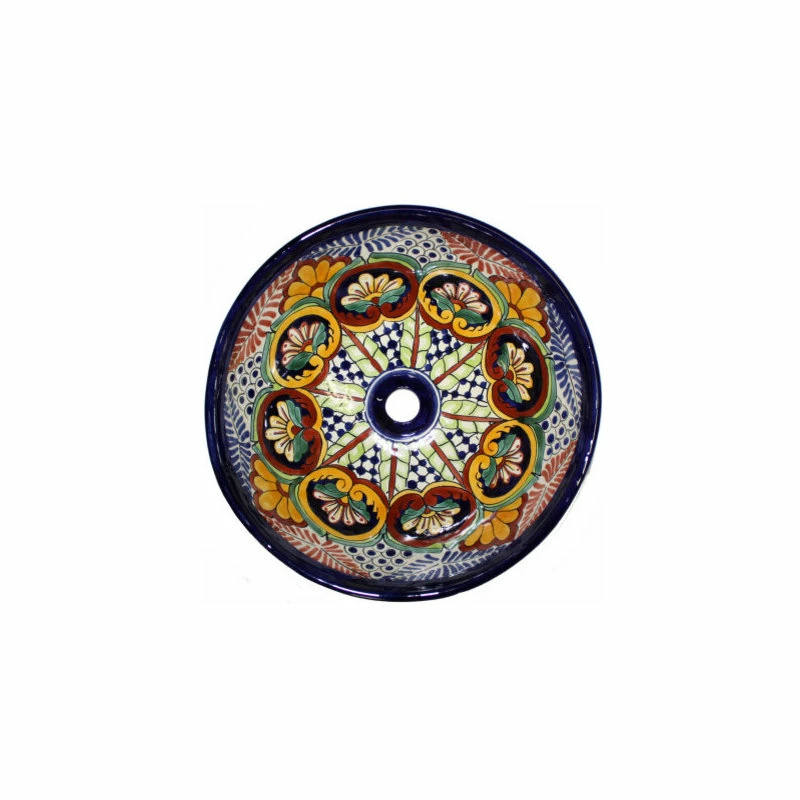 This bathroom vessel sink has a cobalt blue border, followed by white band around the sink border. It is intended to be over-mounted. Its exterior surface is painted as well as the interior one. The central part is much lighter with a mesh-like pattern and blue dots on each mesh intersection. It has a round base (where it sits) about 6 in diameter and 1″ tall, which means, the inside dimensions are about 14″ by 4 1/2″ deep. It doesn’t have an overflow system.”
