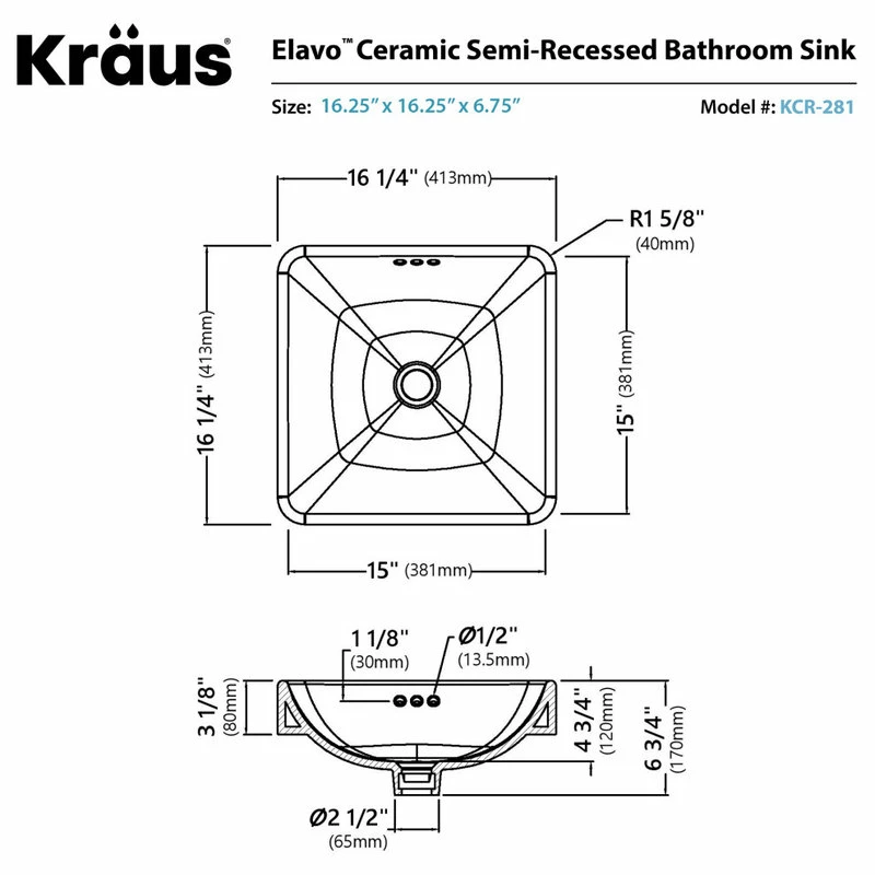 - Sink Dimensions: 16 1/4″ L x 16 1/4″ W x 6 11/16″ H