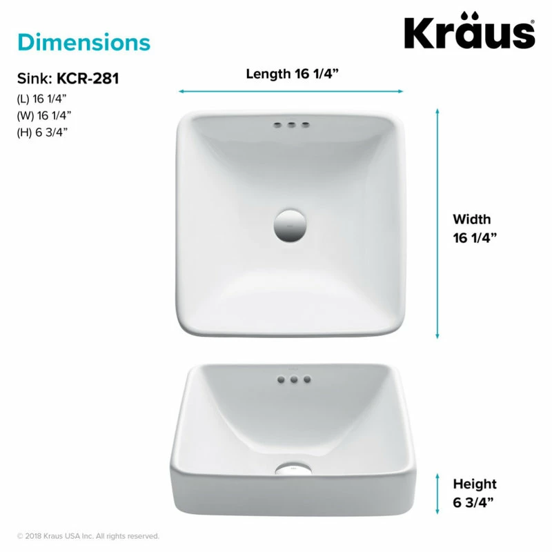 - Sink Dimensions: 16 1/4″ L x 16 1/4″ W x 6 11/16″ H