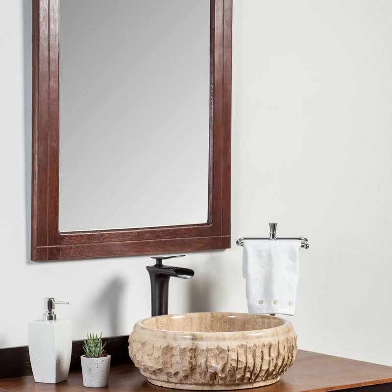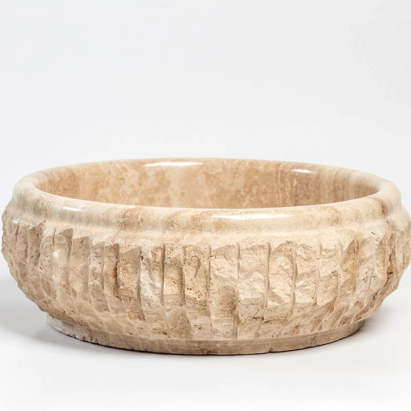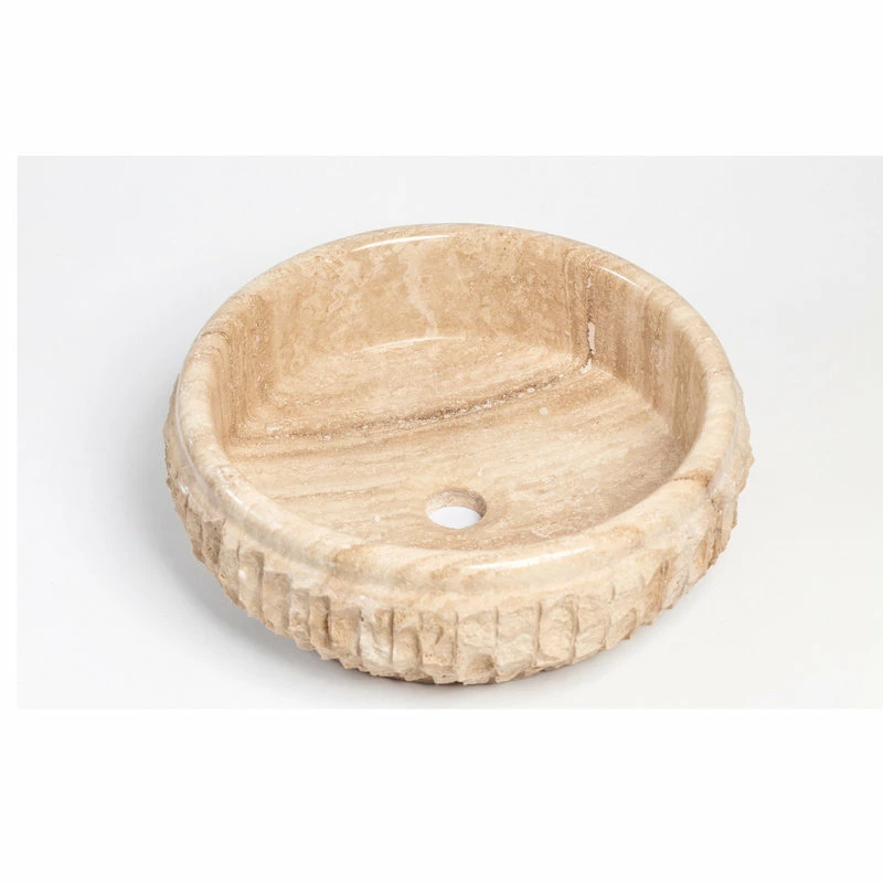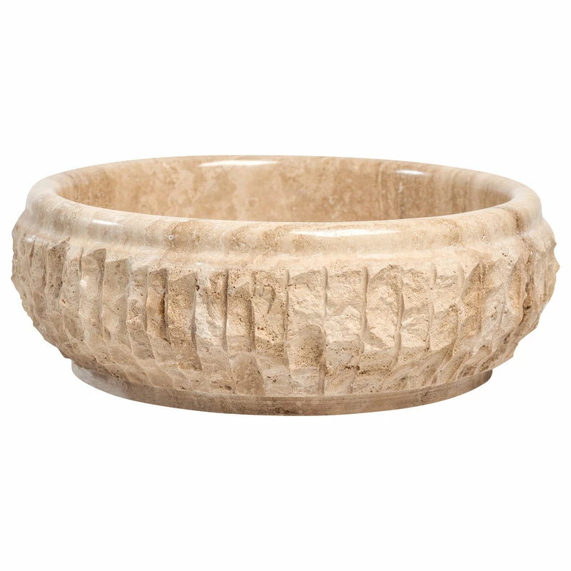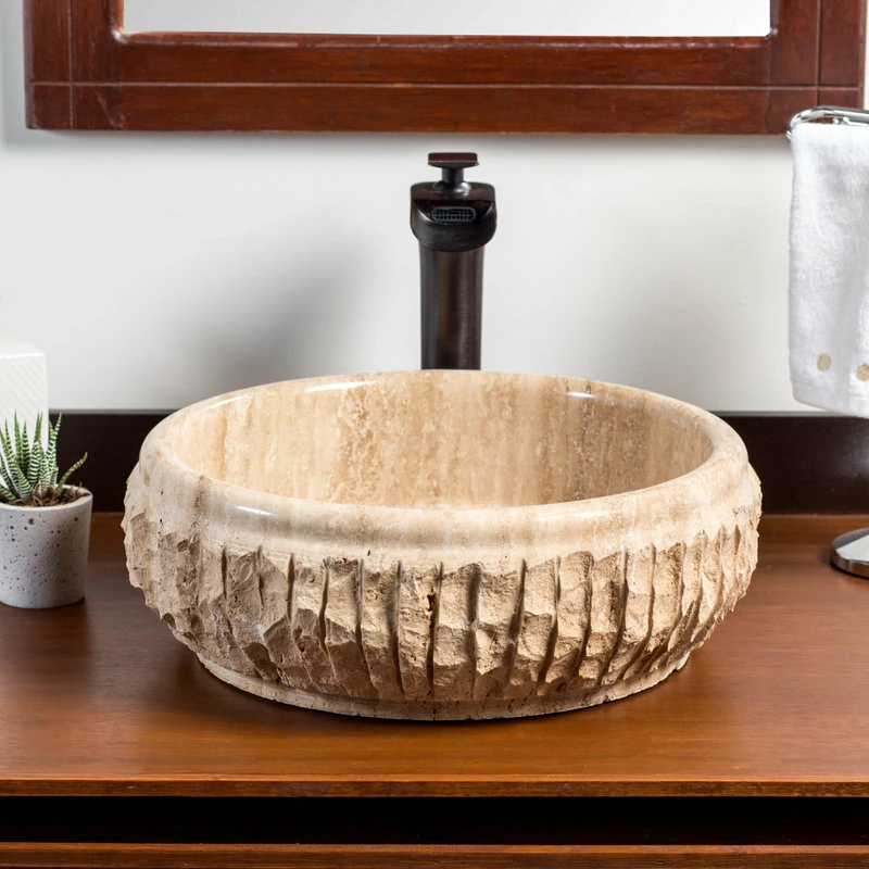 The Chiseled Travertine Vessel Sink will add a touch of nature to your bathroom project. It is made from one solid piece of travertine. It has a polished interior and rustic exterior. Each sink is unique and considered an individual work of art. Please note that there may be variation in stone color and veining.