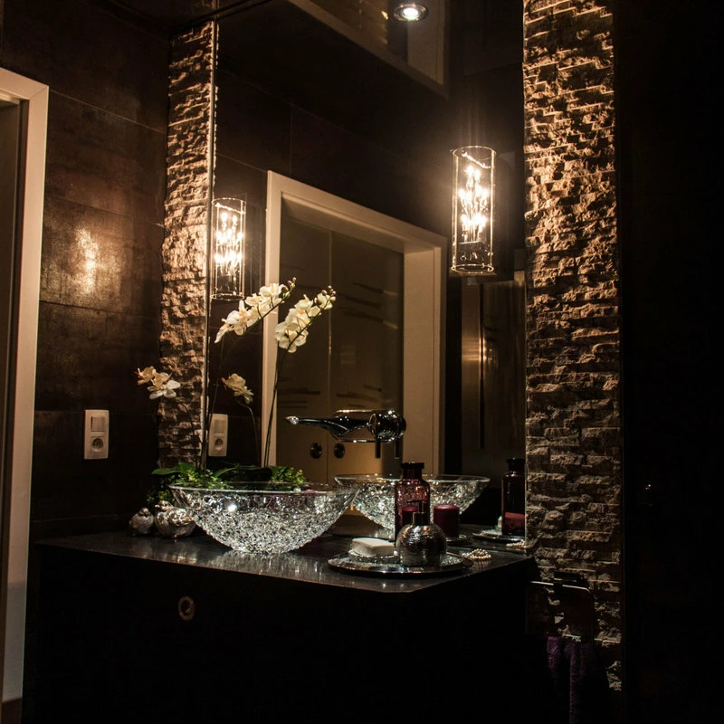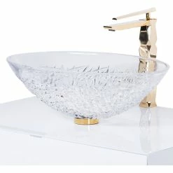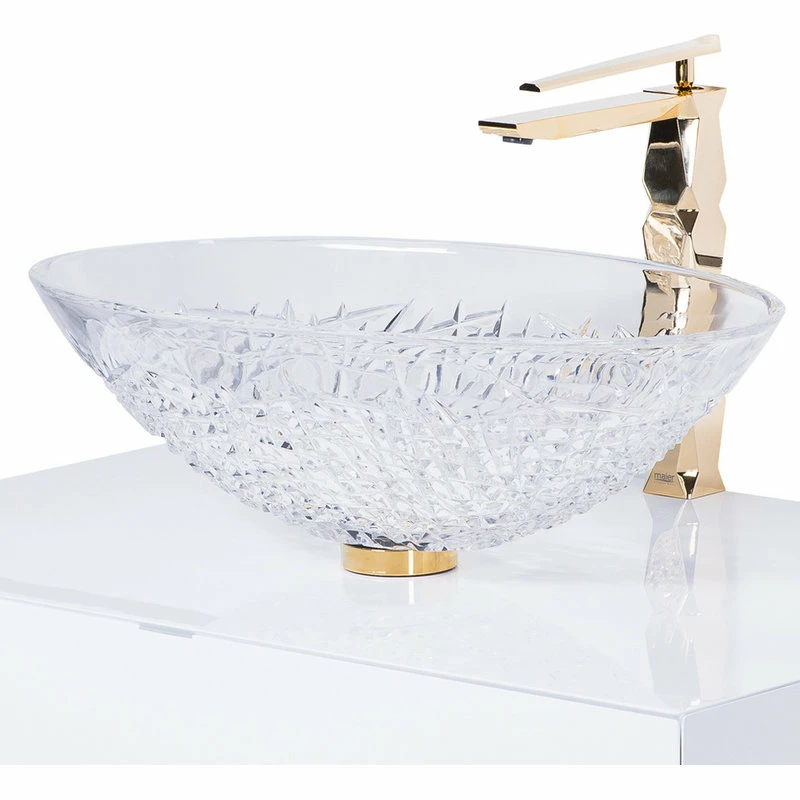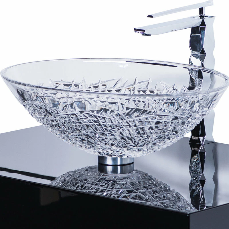 Lavish and splendidly striking, the De Medici Ice Oval vessel- sink, is a sculptural masterpiece majestically formed into an elegant work of art. This vessel sink, perfect and pristine, like a block of ice that has been slowly chipped away to reveal its true beauty. This luxury vessel-sink makes an intense statement all on its own, and though it will compliment a contemporary style best, it will also enhance a traditional design setting. Made out of luxurious crystal based material enhanced with its true color. De Medici Ice Oval is available in designer inspired color: Transparent. This luxury vessel-sink represents the fashion of luxury synonymous with sophistication to your bath or powder room. Countertop installation ensures this sink will stand out in your bathroom as a striking focal point. Cristallo De Medici is one of the most exquisite and cutting-edge crystal design materials made of pure crystal with a 24%l lead content. These products are mouth-blown & beveled in by hand. Cristallo De Medici is unique making it suitable for most luxury design applications.