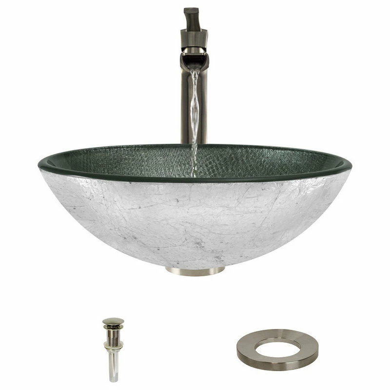 This 1/2″ thick, tempered-glass vessel is circular with a silver mesh pattern embedded in the smoky black interior; while the exterior displays a matte silver appearance. Its non-porous surface is extremely attractive and sanitary – naturally resistant to stains, odors, discoloration, and heat damage. With an overall measurement of 16 1/2″ x 16 1/2″ x 5 3/4″, it will require a minimum-width cabinet of 18″. The 731-BN , single-handle, vessel faucet reaches a height of 12 1/4″ and features a classic trough-style spout with a 4″ reach. Its sleek lines gradually widen and contract to create a stunning design statement. The single handle has a flat top with an inverse curve below to mimic the spout design; and it easily sets just the right water flow and temperature. Ceramic disc cartridges assure long-term, dependable operation, and a beautiful brushed nickel finish completes its distinctive appearance. The faucet is constructed without lead and is compliant with NSF (National Sanitation Foundation) standards, the Safe Drinking Water Act, the cUPC (Uniform Plumbing Code of the United States and Canada), the ADA (American Disabilities Act) and carries the EPAs WaterSense label. The included sink ring stabilizes the curved bowl above the counter and coordinates with the brushed nickel finish of the other fixture’s. Additionally, a spring-loaded, vessel pop-up drain (vpud) is included, which opens and closes with a simple press to its attractive brushed nickel cap.