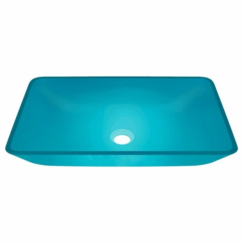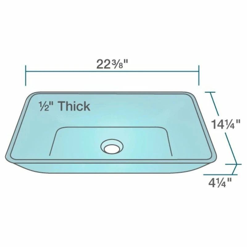 This 1/2″ thick, tempered-glass vessel is rectangular with blue-green glass which is both opaque and reflective. It features a flat bottom and 45-degree arching sides. Its non-porous surface is extremely attractive and sanitary – naturally resistant to stains, odors, discoloration, and heat damage. With an overall measurement of 22 3/8″ x 14 1/4″ x 4 1/4″, it will require a minimum-width cabinet of 24″. This listing does not include any accessories.