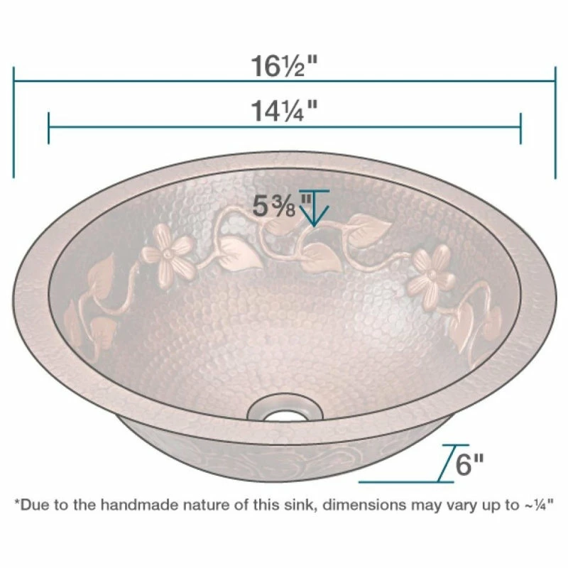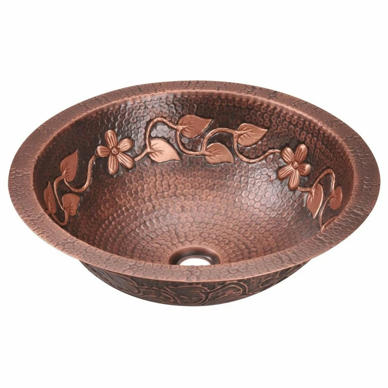 An exquisite hand-embossed floral pattern circles the interior and exterior of this copper bowl in partnership with radiating hand-hammered punch marks. Its perpetually changing patina adds to its charm. A special feature of this design is that it can be mounted under, over, or on the counter as a vessel sink. With an overall measurement of 16 1/2″ x 16 1/2″ x 6″, it will require a minimum-width cabinet of 18″. This listing does not include any accessories.