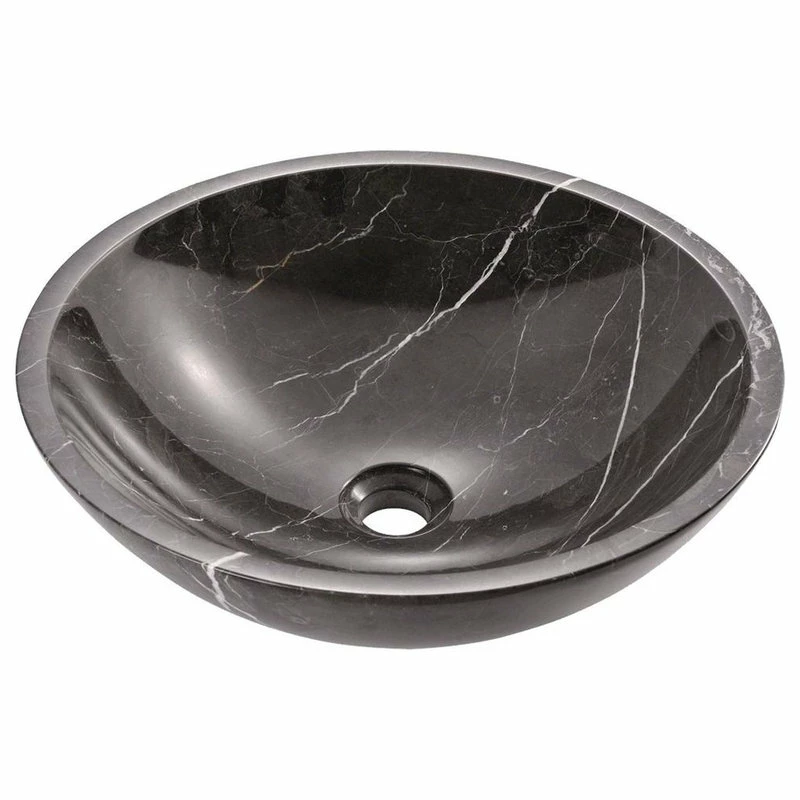 This 5/8″ thick, black marble vessel is perfectly honed into a circular shape and highly polished inside and out. Its rich darkness is broken up by both bold and subtle veins of white, tan and orange. A mood of classical revival will fill the room when this rock solid choice is installed. With an overall measurement of 16 1/2″ x 16 1/2″ x 5 1/2″, it will require a minimum-width cabinet of 18″. This listing does not include any accessories.