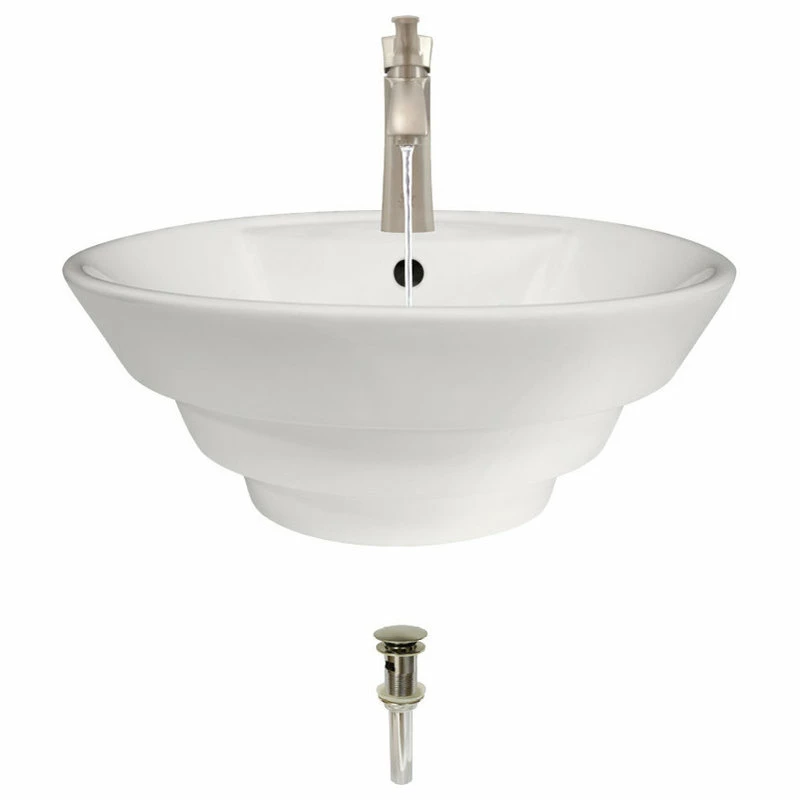 - Original styling β a tiered, circular bowl with a curved, rear platform of faucet and overflow holes