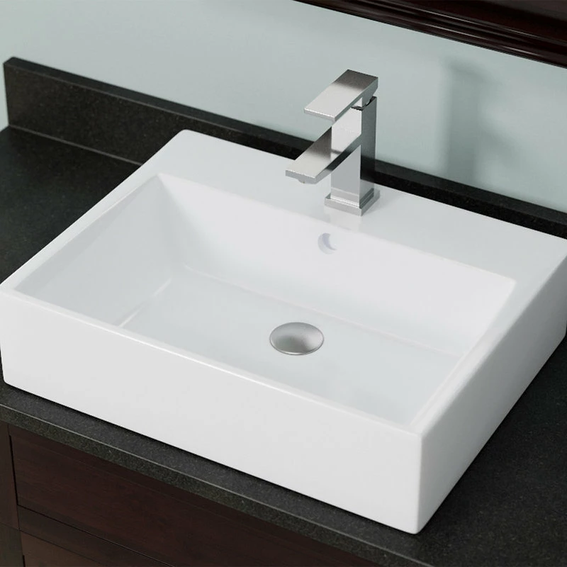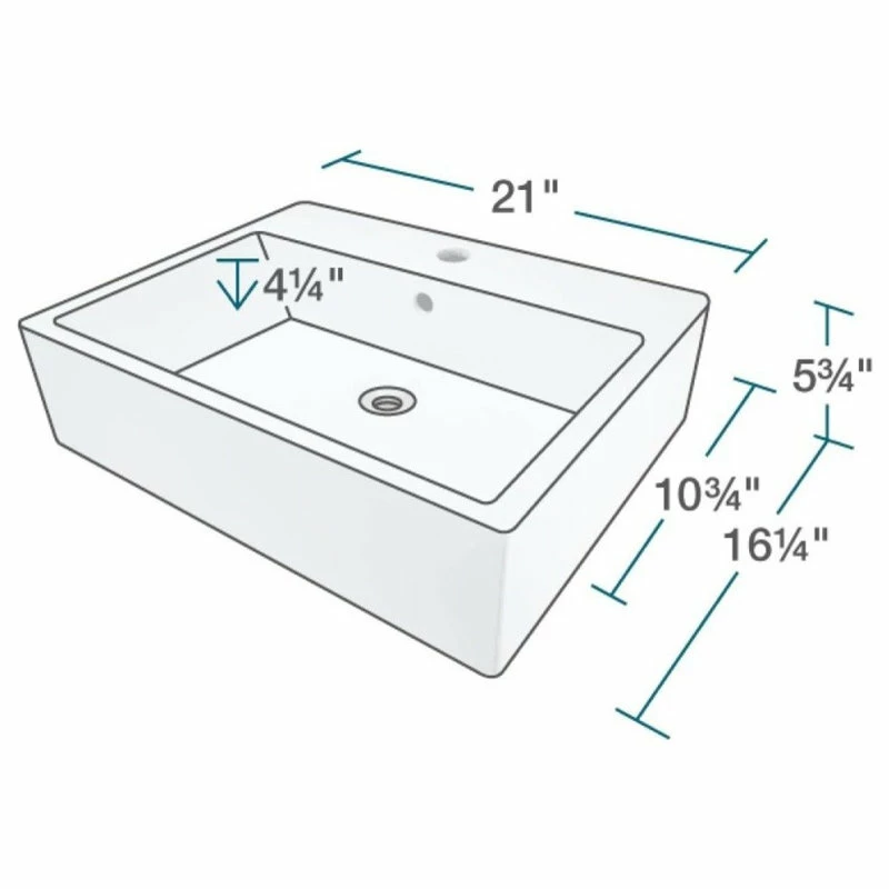 This flat-based, rectangular vessel features 90Β° corners and a platform with a pre-drilled faucet hole and overflow. The additional vitreous china coating on this model creates an even more impervious and sanitary surface than standard porcelain. With an overall measurement of 21 in. x 16-1/4 in. x 5-3/4 in., it will require a minimum-width cabinet of 21 in. Due to the design of some vessels and their open backs, faucet hardware and unfinished areas may be seen if installed directly in front of a mirrored surface.