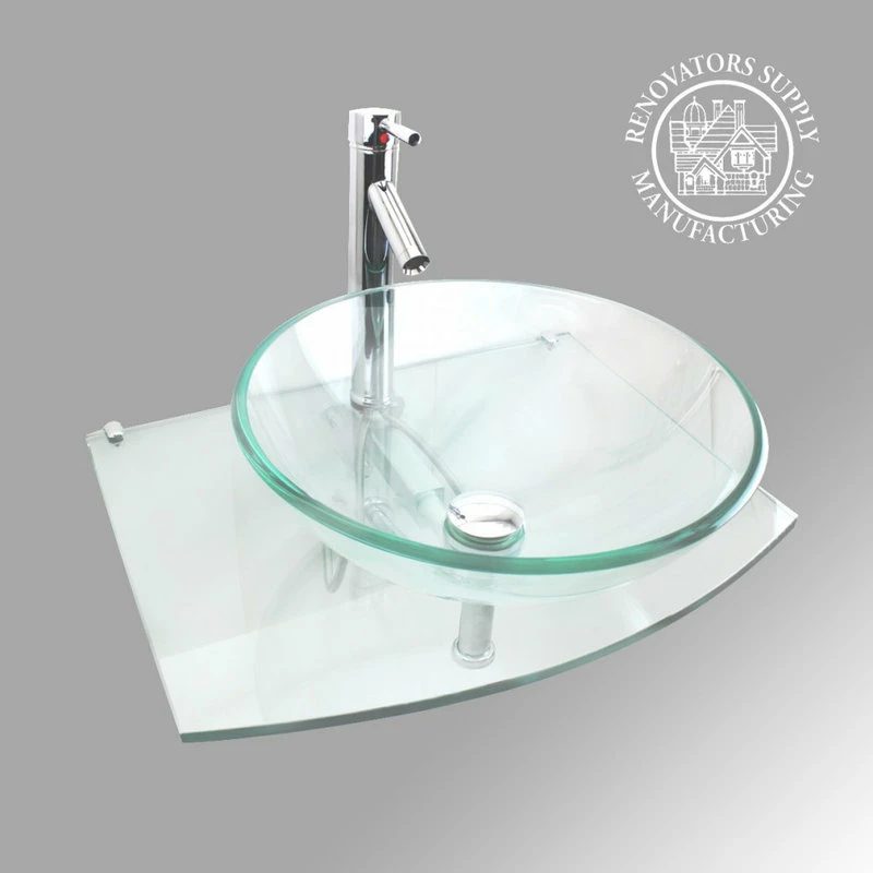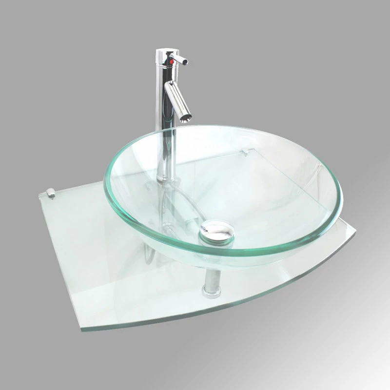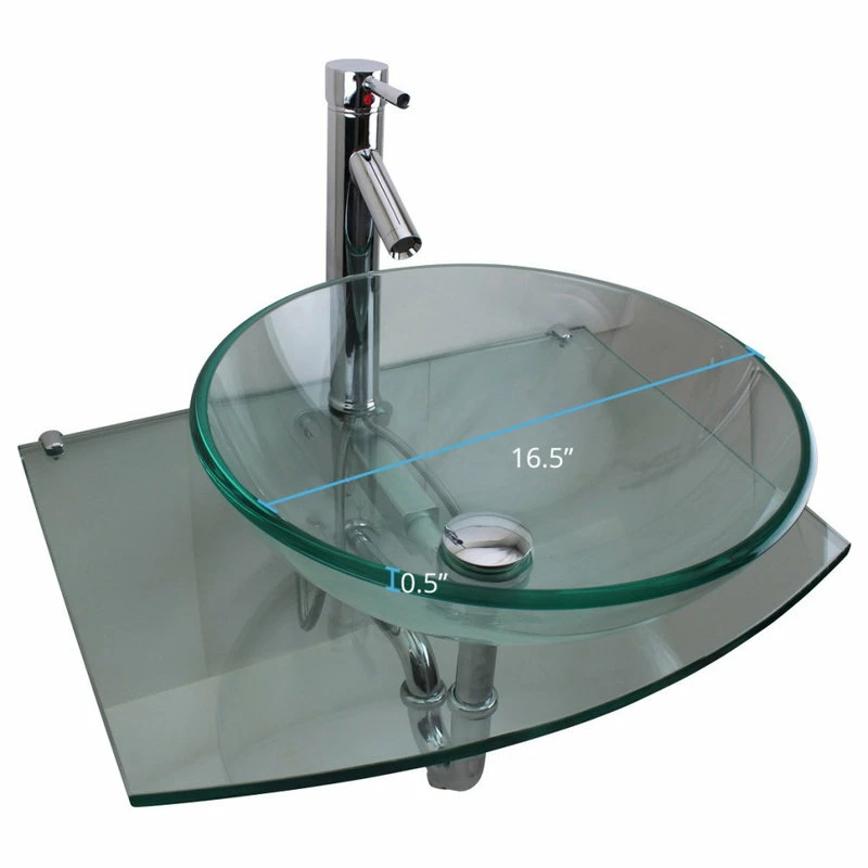 Item 10914 HALO ROUND BOWL TEMPERED GLASS WALL MOUNT SINK COMBO Halo is a bold contemporary vessel sink. Add a touch of elegance to your bathroom with our modern and stylish tempered glass round vessel sink combo. This easy clean, smooth surface sink is manufactured of high strength tempered glass and the faucet has leak proof ceramic cartridge. The bathroom sink is coupled with all chrome plated hardware – Faucet and Pop Up Sink Drain. FEATURES – Save space without sacrificing the luxury of a spacious sink.