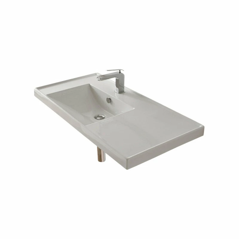 This stylish sink made out of beautiful white ceramic comes with an overflow and multiple faucet hole options. Adding to its versatility, it can be ordered as either a self rimming or as a wall mounted sink. Perfect for contemporary or modern styled bathrooms, its ample counter space on the right side creates the perfect space for bathroom accessories, towels, or any other needs.