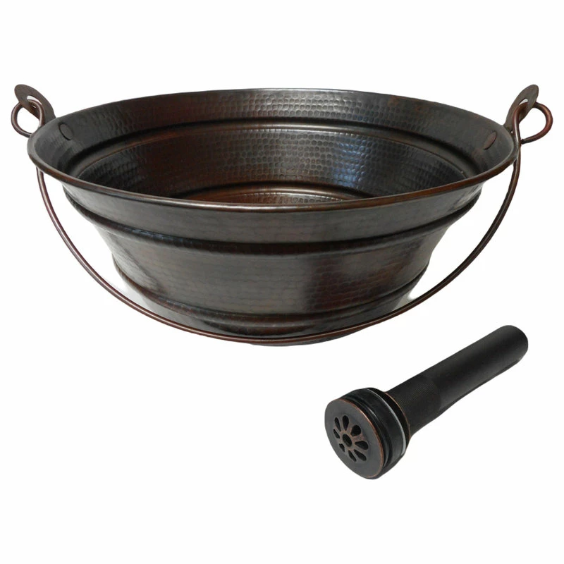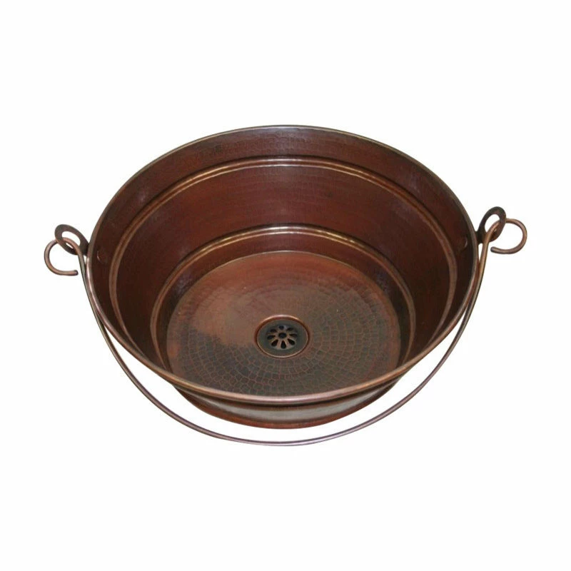 15โ rustic Bucket design, created of 18-gauge copper which is hand-hammered to provide a rustic antiqued look. This unique sink will be the center piece of your bathroom. This copper sink is installed as a vessel