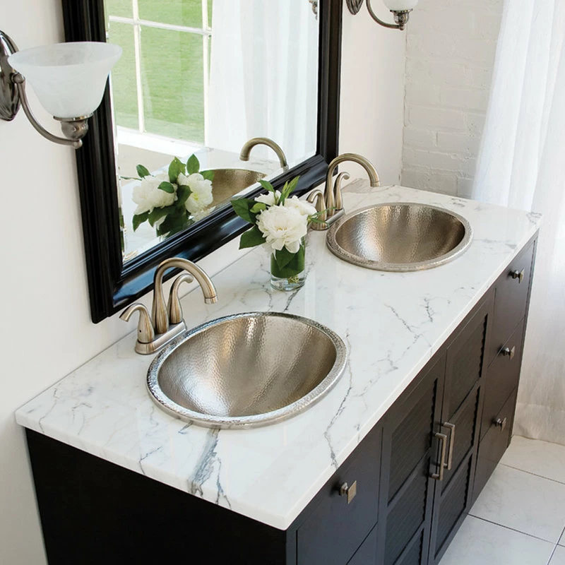 A shimmering hammered nickel finish and a clean oval shape are what make the Edison from SINKOLOGY shine in any bathroom. It comes with a construction that can be mounted as a drop-in or undermount to offer your design versatility. And with its maintenance-free finish, it looks perfect in your vanity on day one and for years to come.