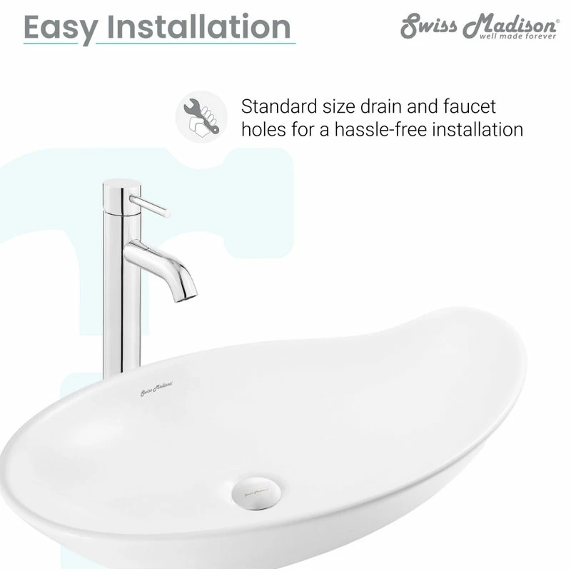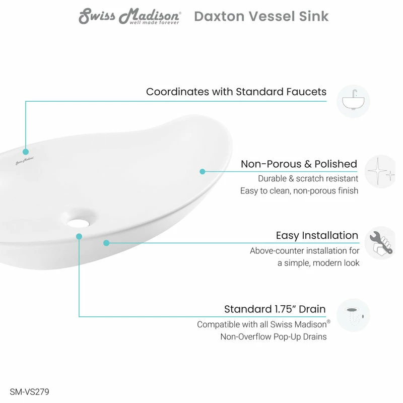 The Daxton Vessel sink is a sleek and modern addition to any bathroom setting. This extremely durable, polished, and non-porous finish makes it not only aesthetically pleasing, but also very practical for long term use. Its scratch resistant and solid, durable ceramic makes this sink stain-resistant and easy to clean. Additionally, this sink coordinates perfectly with standard faucets, making it a hassle free and easy above-counter installation. This vessel sink is compatible with all Swiss Madison non-overflow pop-up drains and is easy to maintain and clean.