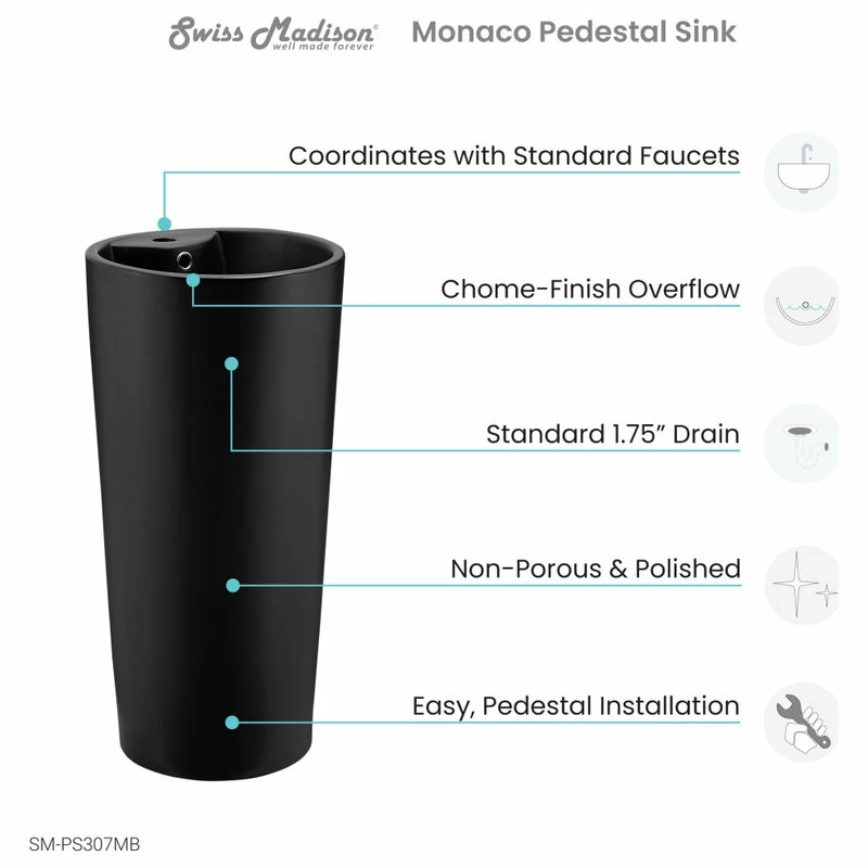 The Monaco One-Piece Pedestal Sink will elevate any bathroom setting. This unique pedestal sink was built with extremely durable ceramic, making it a high-quality product thatโs aesthetically pleasing and built to last. Additionally, this sink was made for easy cleaning and maintenance, while giving your bathroom a more open and spacious feel.