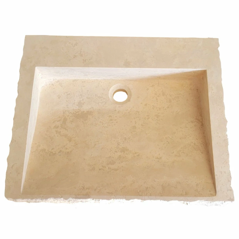 The Chiseled Rectangular Vessel Sink in light travertine is made from one solid piece of natural stone. This sink has a chiseled outside edge that adds to the natural beauty of the sink. This sink is the perfect option for your home or restaurant project. This sink is available in light travertine, noce, sea grass and beige marble.
