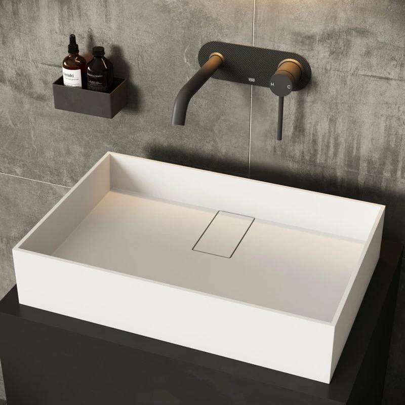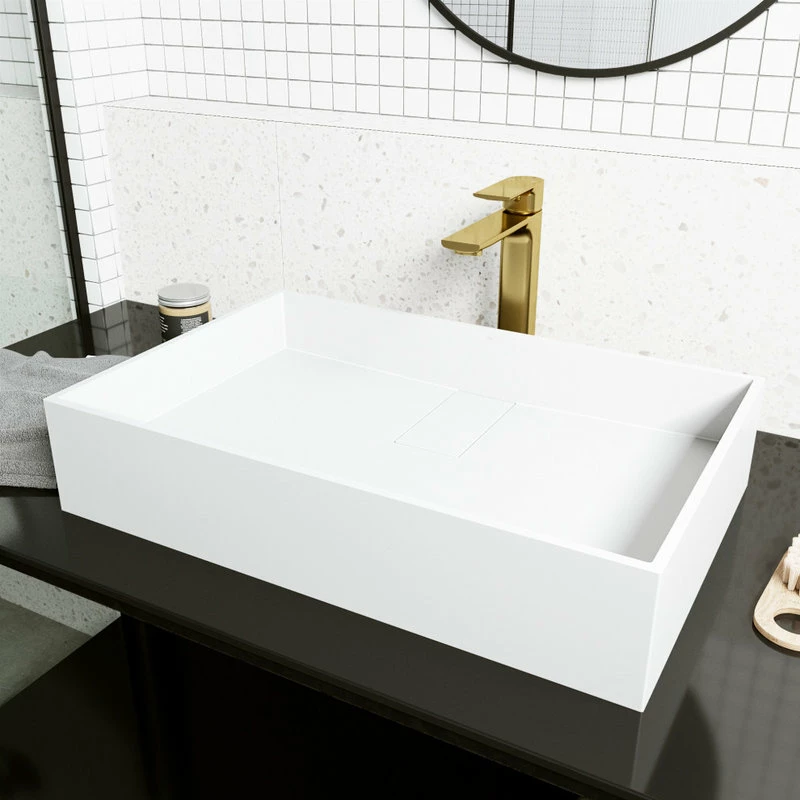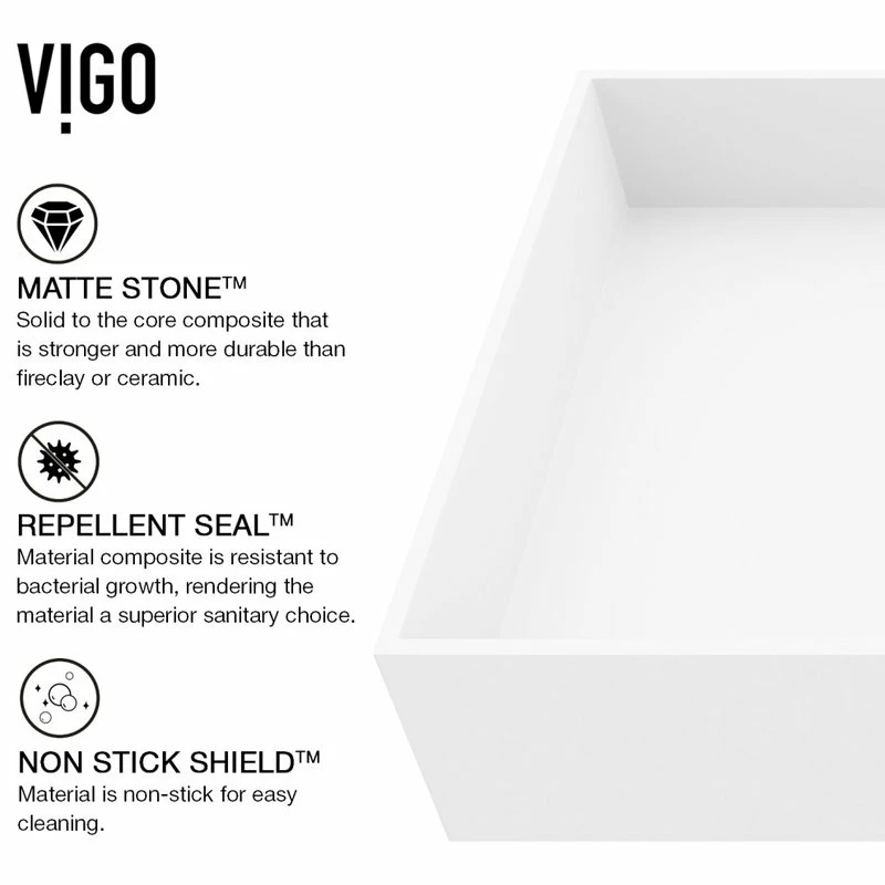 A rectangular design shape and exclusive stone material distinguish The Bryant by VIGO. Constructed from VIGO’s exclusive Matte StoneTM material, this vessel bathroom sink is solid-to-the-core, more robust and more durable than conventional vessel sink materials like fireclay or ceramic that chip and crack. Its unique stone material delivers a clean white color and a smooth to the touch surface. Its drain plate elegantly hides the drain and provides a flawless cleaning experience. The Bryant matches innovation with style to create a highly functional art fixture for your bathroom.
