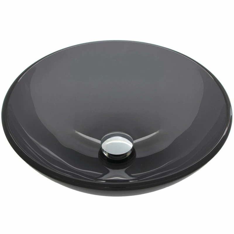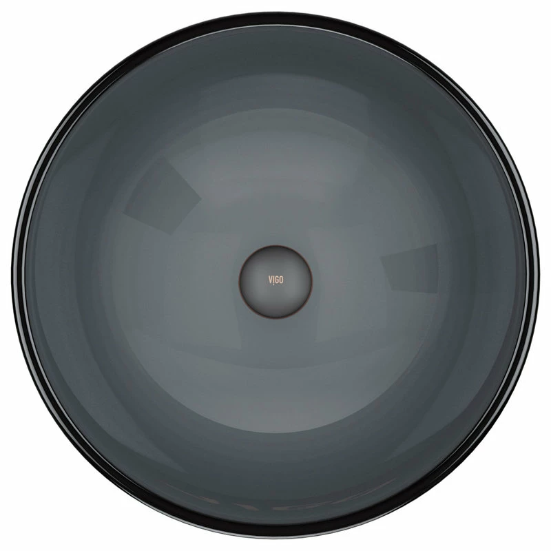 The Vigo Sheer Black glass vessel bowl features a highly reflective, sleek, transparent black color, creating a striking centerpiece for any modern bath.