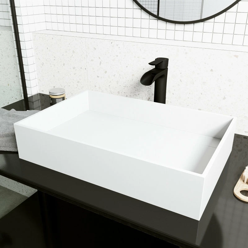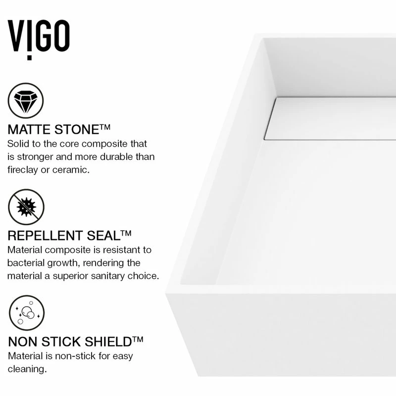 A rectangular design shape and exclusive stone material distinguish The Montauk by VIGO. Constructed from VIGO’s exclusive Matte StoneTM material, this vessel bathroom sink is solid-to-the-core, more robust and more durable than conventional vessel sink materials like fireclay. Its unique stone material delivers a clean white color and a smooth to the touch surface. Its drain plate elegantly hides the drain and provides a flawless cleaning experience. The Montauk matches innovation with style to create a highly functional art fixture for your bathroom.