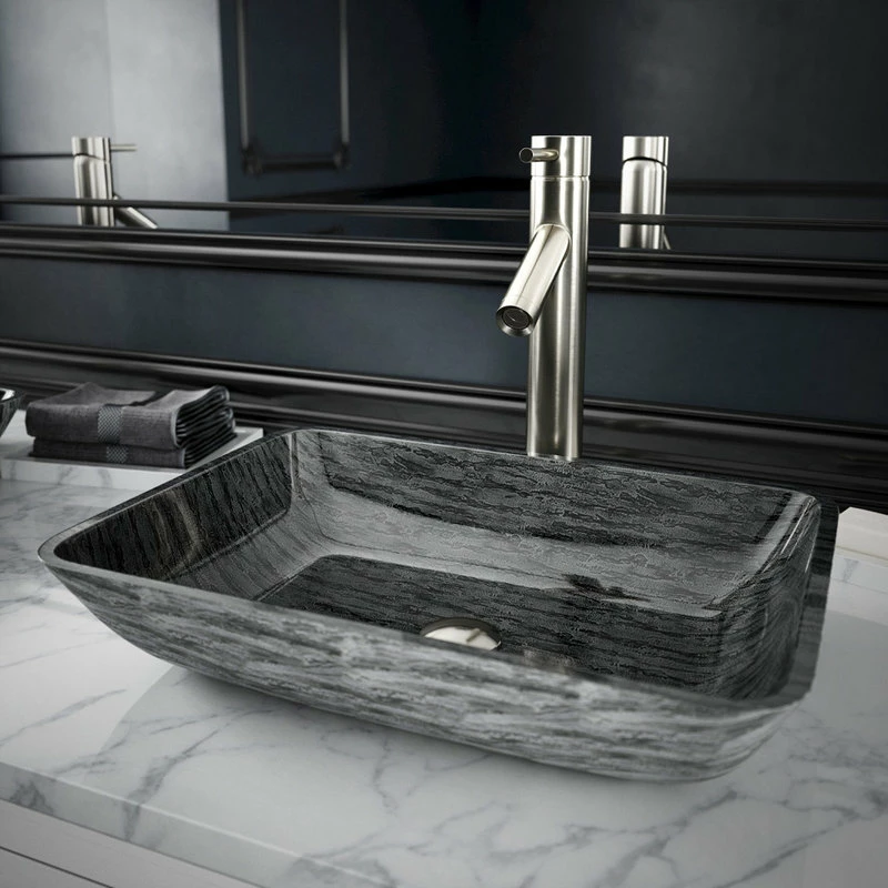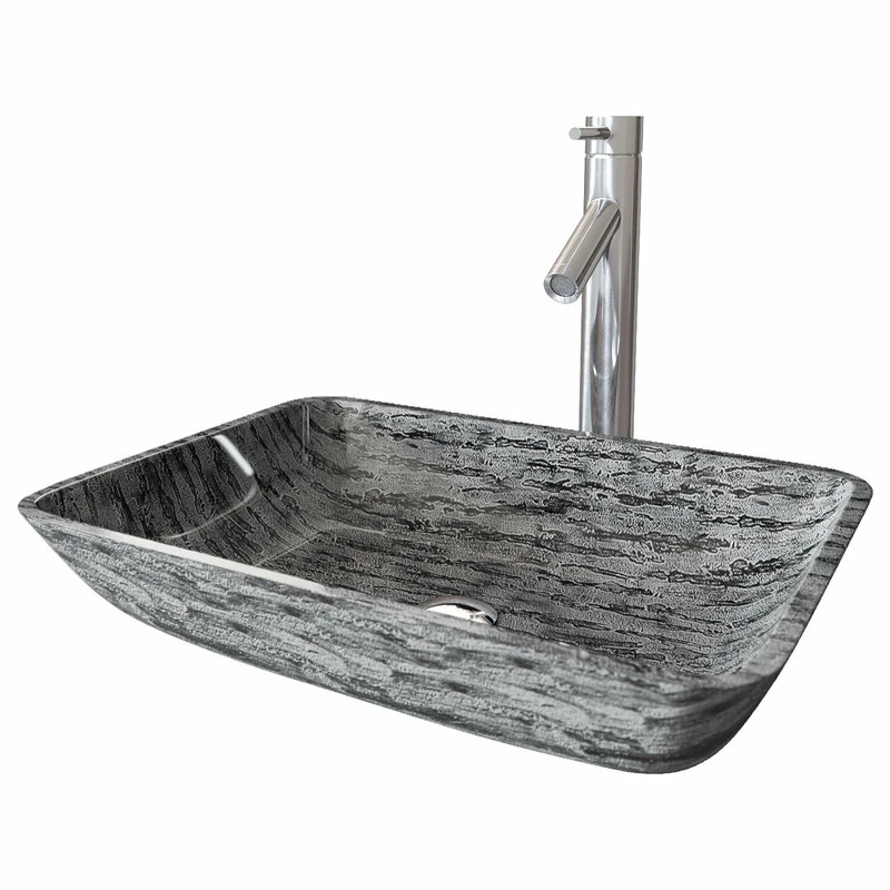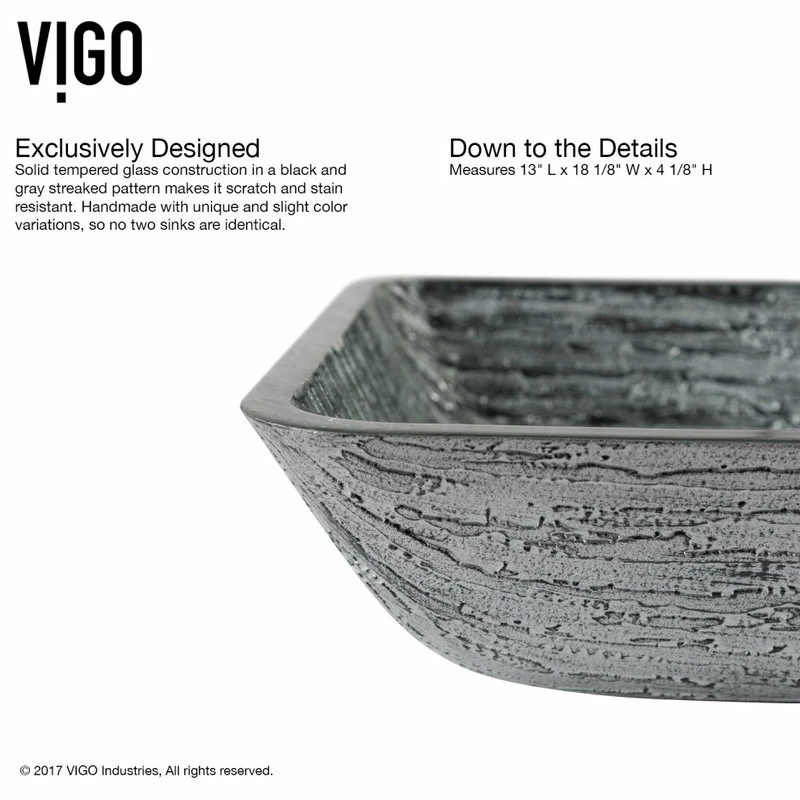 The VIGO Titanium rectangular glass vessel bathroom sink with Dior faucet brings two uniquely designed products together in one impeccable combination. The hand-painted vessel sink is made from solid tempered glass, keeping it safe and resilient to dangerous shards and breakage. The sink has a smooth, polished interior and a textured exterior, which helps it withstand scratches and makes it easy to clean. The sink pairs perfectly with the VIGO Dior vessel faucet, a single-handle model with a premium hardware coating that gracefully resists wear and tear. This set will impress you with its premium hardware and a complementary, matching pop-up drain.