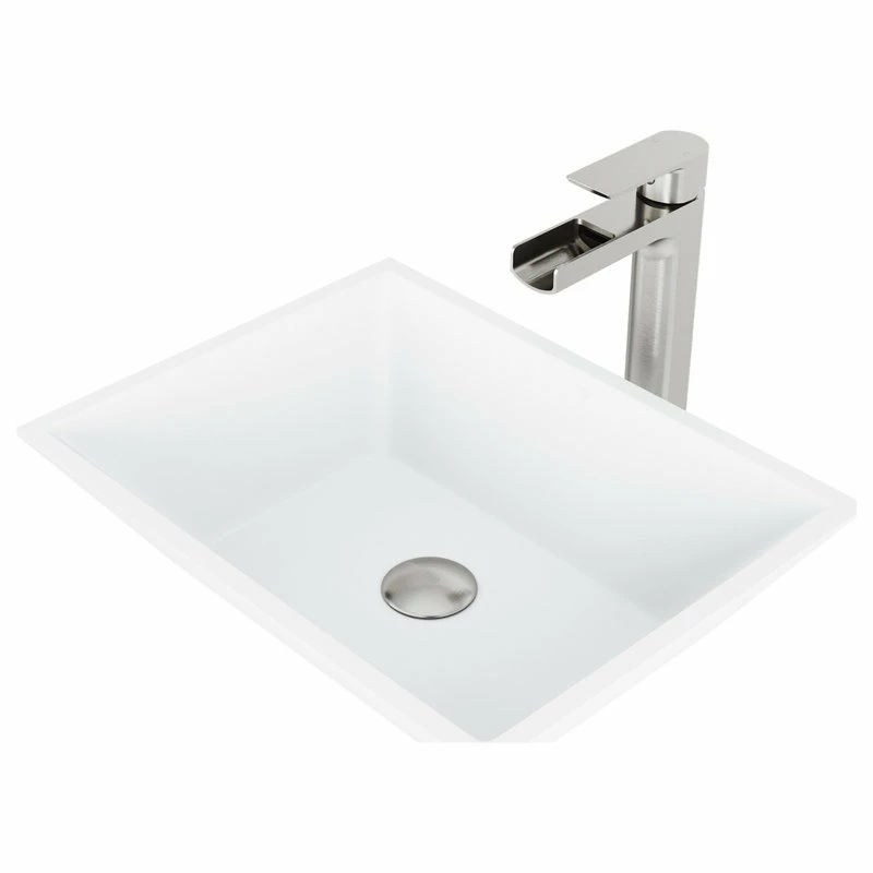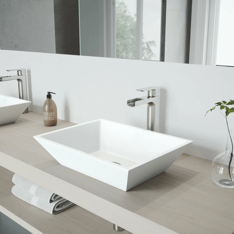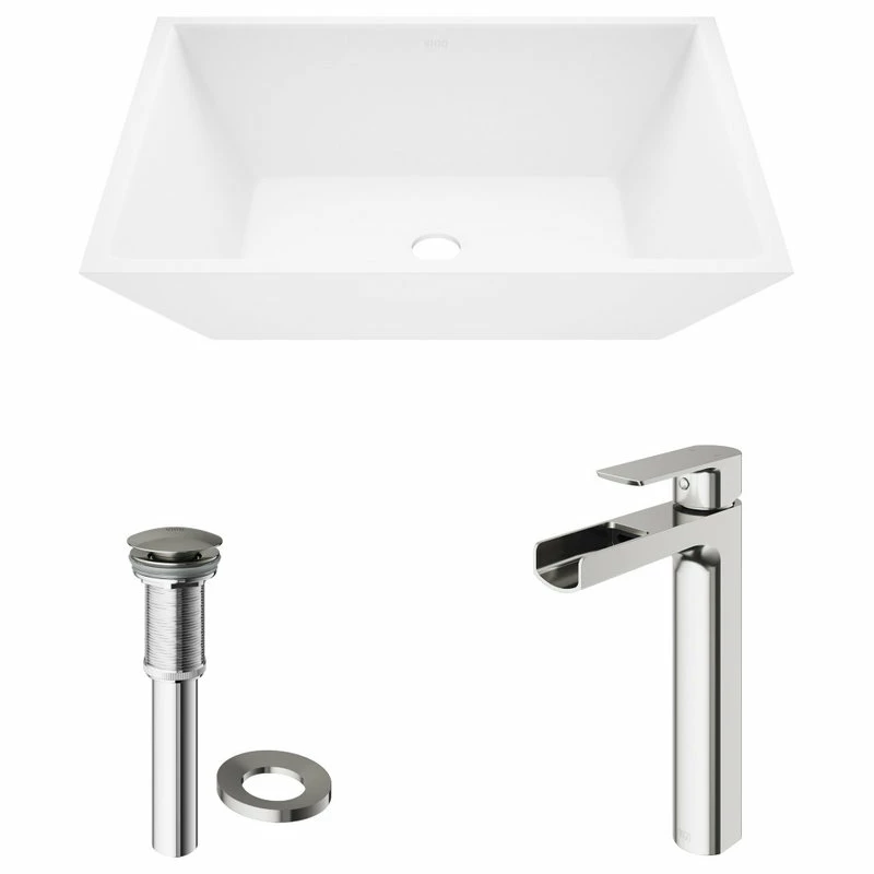 The VIGO Vinca Matte Stone Vessel Bathroom Sink adds a touch of modern to any bathroom. The Vinca sink is crafted from VIGO’s signature Matte Stone, a proprietary solid surface material that resists cracks, scratches and stains. This set comes complete with the ultra-stylish VIGO Amada Vessel Bathroom Faucet, finished in brushed nickel. Sharply lined, the brushed nickel finish doesn t leave fingerprints making this faucet a beautiful center set of your bathroom. The trough faucet creates a calming presence in the bathroom. A matching pop-up drain is also included.