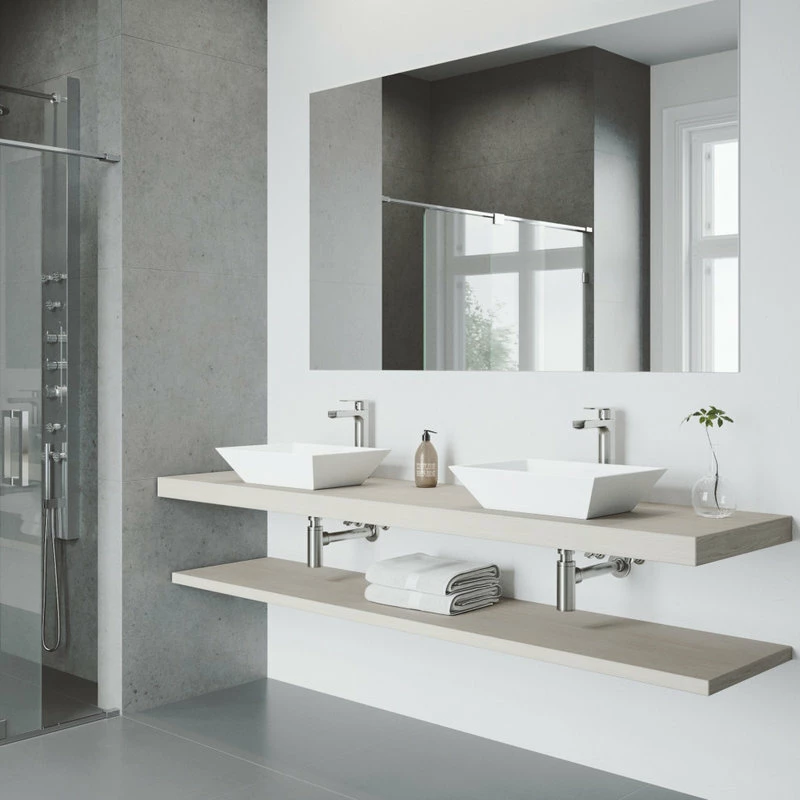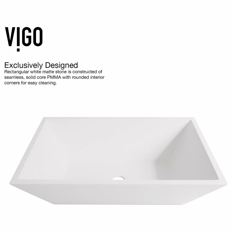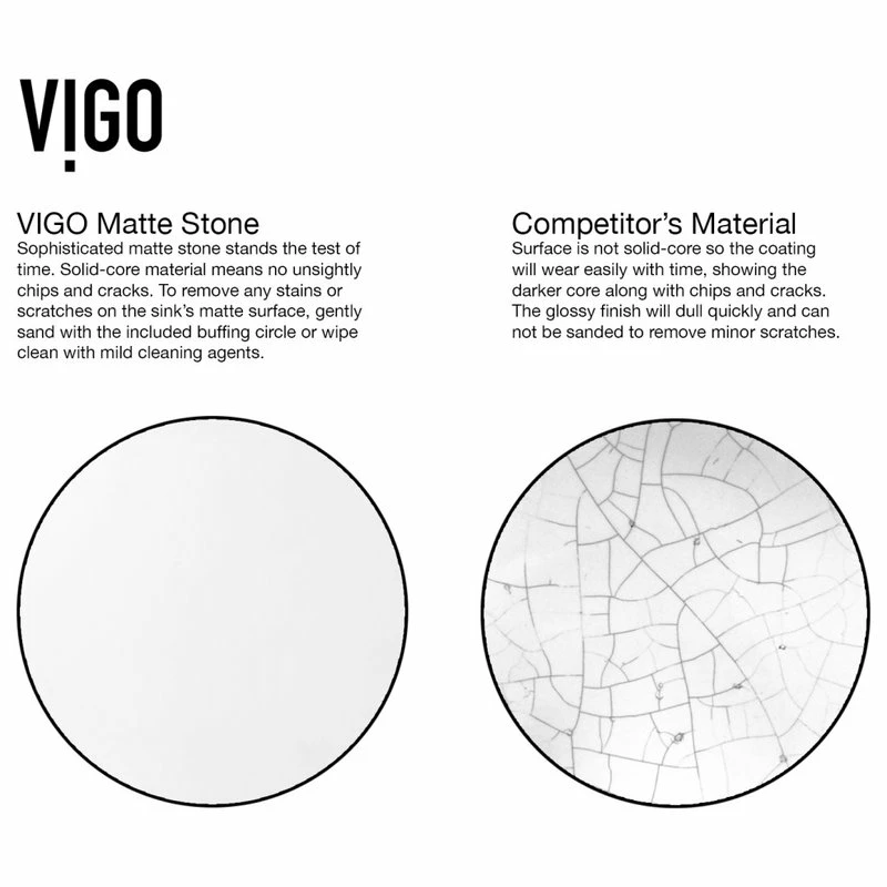 SOLID CORE COMPOSITE: VIGO’s signature non-porous Matte Stone is a PMMA composite solid surface designed for durability. The surface is stain/crack-resistant and hand-polished inside and outside upon production
